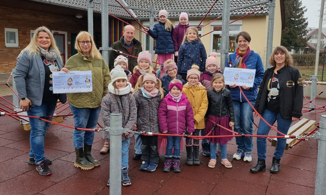 Während der beiden Fremdensitzungen und der Weiberfastnacht in Mackenzell wurden fleißig Spenden gesammelt für den Förderverein der Kita St. Laurentius  und den Förderverein der Grundschule Mackenzell. Das Publikum war wieder mehr als großzügig, so dass am 5. März 2024 pro Einrichtung 510 € übergeben werden könnten.